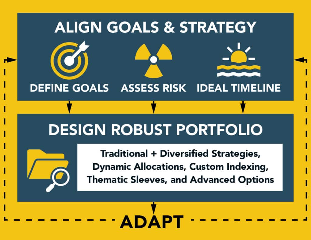 Our process begins with defining your goals, assessing your risk tolerance, and discussing your ideal time horizon.